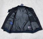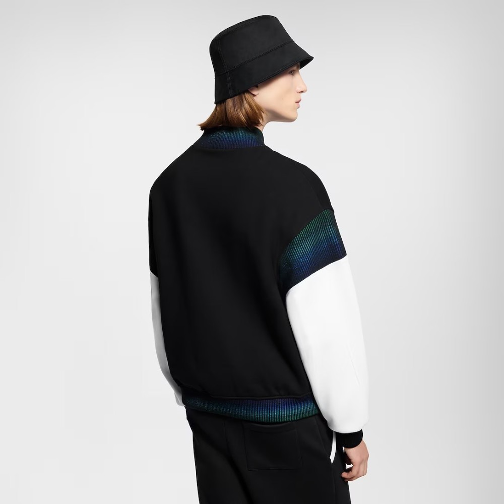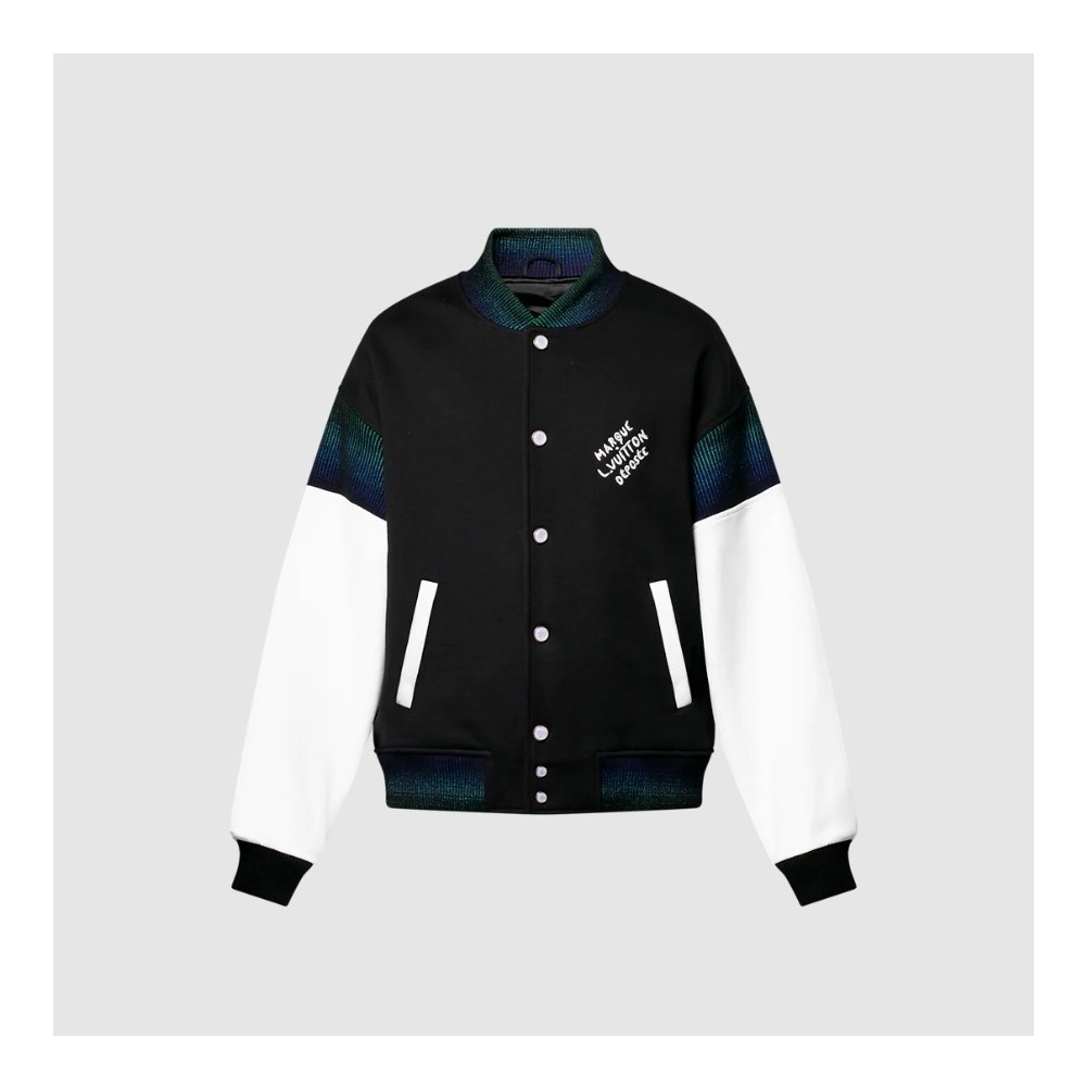 부드럽고 둥근 실루엣으로 재해석해 봄에 착용하기 좋은 상징적인 바시티 재킷. 면 저지 소재. 여유 있는 어깨 라인. 소매 윗부분과 칼라, 허리 라인을 장식한 무지갯빛의 세련된 리브드 디테일. 가슴 부분에 화이트 색상으로 수놓은 Marque L.Vuitton Déposée 자수. 댄디한 감성을 선사하는 진주 효과를 더한 버튼으로 제작 되었습니다.